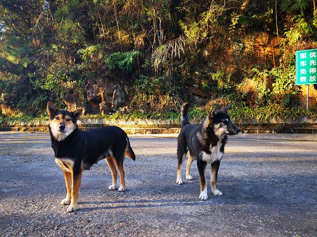 井冈山五马朝天风景区门口的小狗很友好,但是某同志因为狗来了而不敢下车。