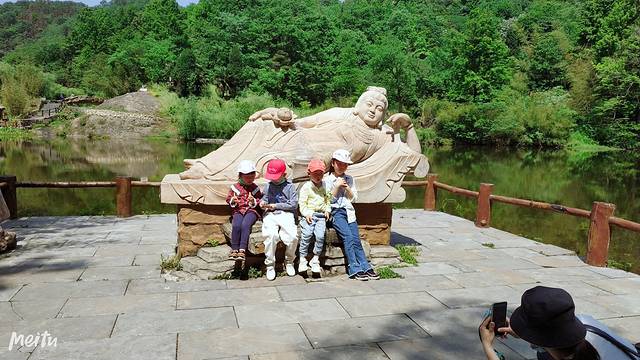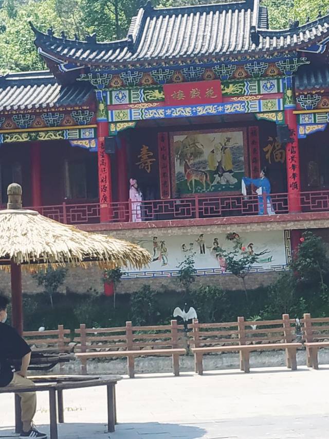 我们上山的时候,我们没有在这里多做停留。跟着人流上去,五月份的天气如果是大晴天的话,太阳还是很晒的,继续向上走分别路过了映月卧观音和莲香廊,继续向上是风情谷的一个特色,花戏楼,我们五一去的时候,一直都有戏剧表演,非常适合戏迷们休息,花戏楼附近小便利店,厕所、洗手台,应有尽有。我们仨带着小娃娃们在这里休息了很长时间,买了些冷饮补充体力,吃饱喝足后继续向山里前进。