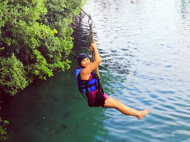 第一次尝试高空滑索,脚下是浩瀚的加勒比,而对面的终点也似乎遥不可及。牙一咬,眼一闭,飞出去,水花四溅中落入水里,然后再奋力游到前方的目的地。~~肾上腺素暴涨的第一次,然后,一次又一次,乐此不疲大笑小蜂。