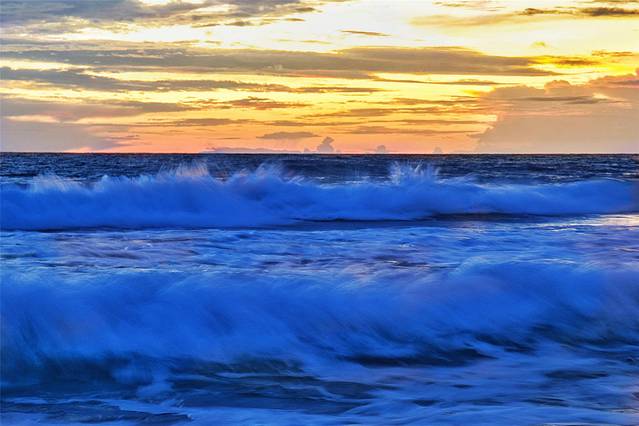 头枕着波涛睡到自然醒,移步到海边,正看见天边朝霞漫天、大海白浪翻卷。