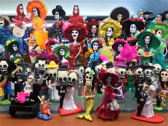驻足在一个个的商铺,欣赏着一件件“恰鲁”(墨西哥传统男装)、一件件“支那波婆兰那”(墨西哥传统女装)、一件件亡灵节的玩偶......像看一场盛大的民俗展览,新奇而有趣。