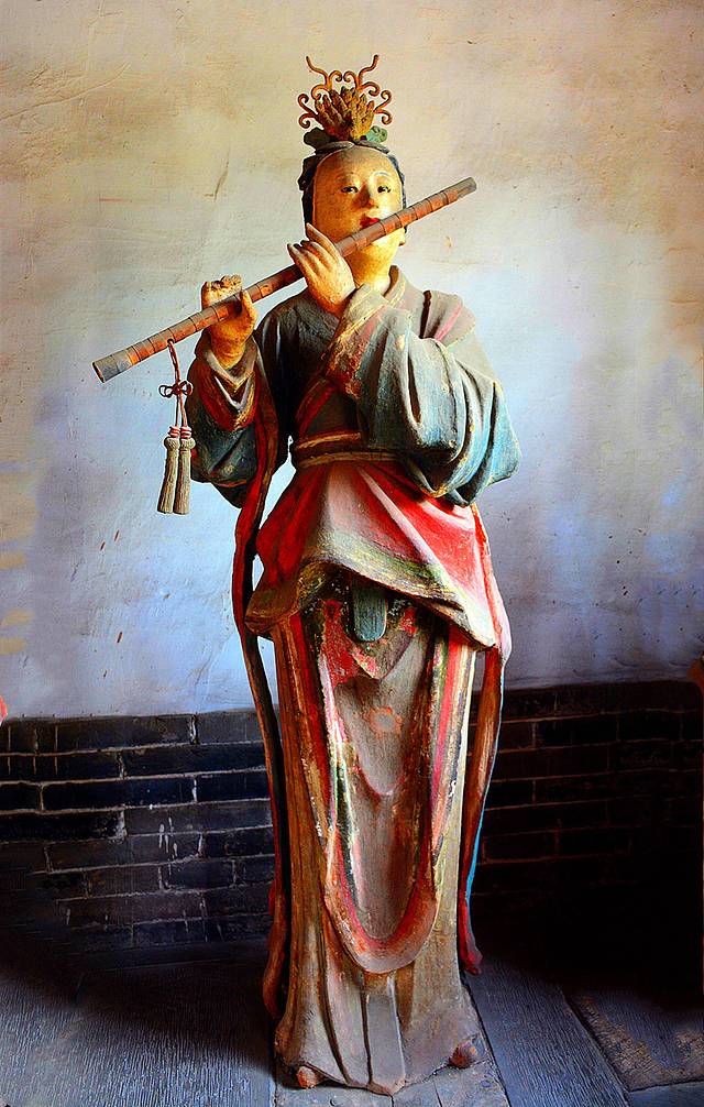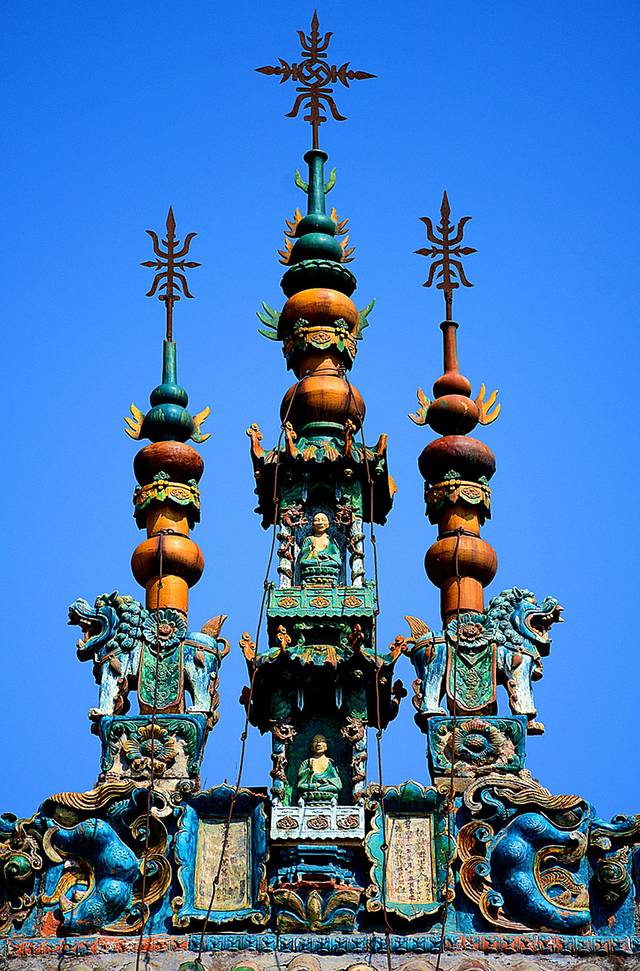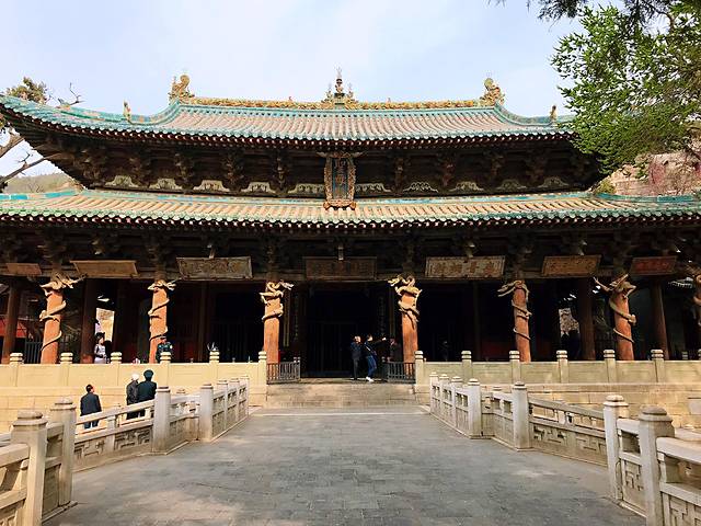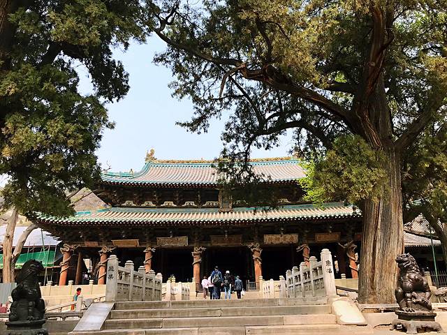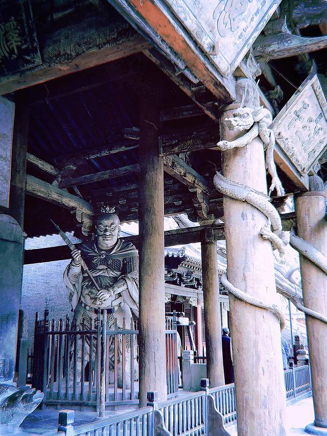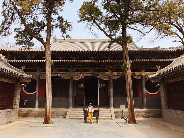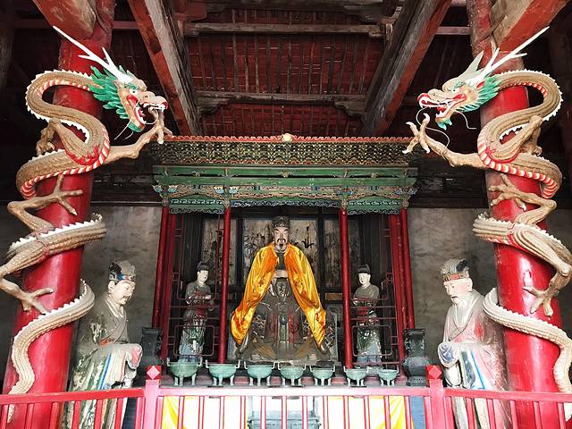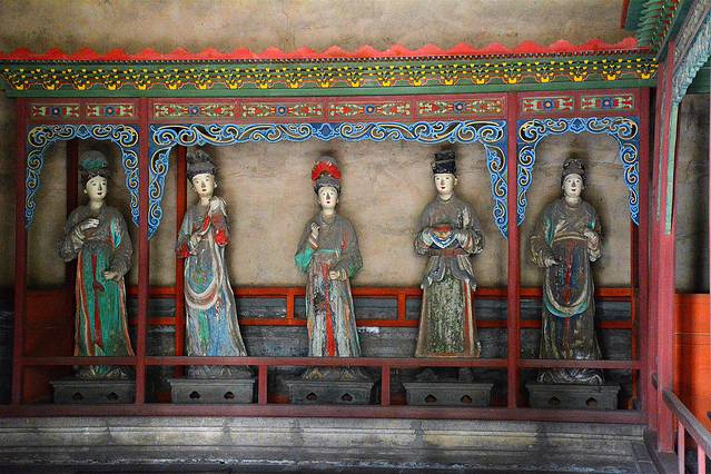 晋祠之美,美在圣母殿。圣母殿是晋祠的主殿,是为纪念姜子牙的女儿、周武王的妻子、周成王的母亲邑姜所建。圣母殿廊柱略向内倾,四角高挑,形成飞檐,几条蛟龙于殿前盘旋。殿堂内宋代泥塑的圣母及44尊侍女,是我国现存宋塑中的珍品,人物身材之柔美,面貌神态之安详,服装色彩之斑斓,实在是美轮美奂。