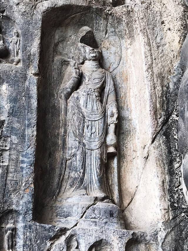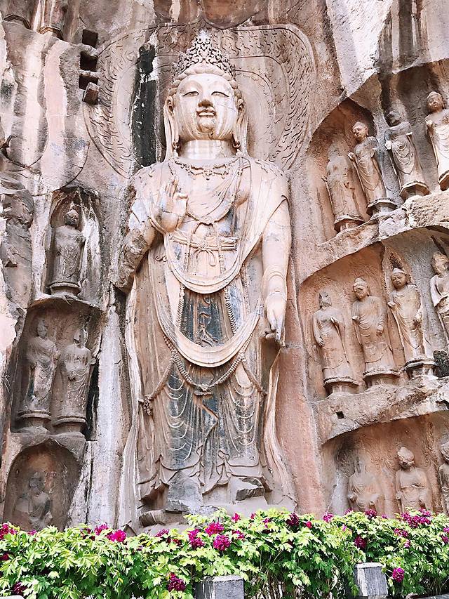 比对着龙门石窟门票上的影像寻到了被称为东方蒙娜丽莎的“卢舍那”。只见她的佛头长达四米,耳朵长达二米,一张秀美丰腴的面庞永远神秘微笑,一双夺人心魄的眼睛永远沉静空灵,一付器宇轩昂的神态永远唯我独尊。相传这便是那个大唐最著名的女人——武则天。