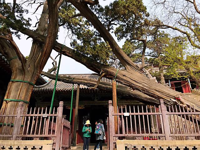 晋祠之美,美在古木。这里的树,以古老苍劲见长,千年以上的老树举目可见。更有西周所植周柏一棵,距今已有3000多年。只见那周柏,树高18米,树周5.6米,主干直径1.8米,向南倾斜45度,树皮皱裂形似卧龙,一身仙风道骨。