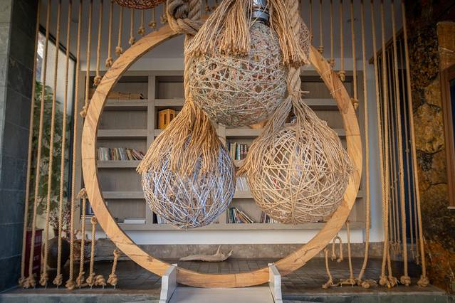 藤球灯饰错落有致地垂挂下来,晚上灯亮的时候,又别有一番风味。