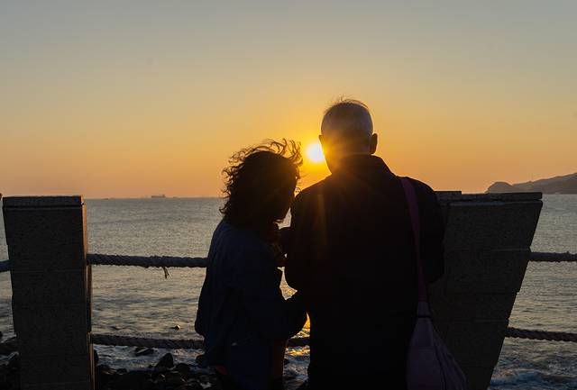 日落时水天相接,这么美丽的背景最适合拍剪影,怎么摆拍都显得很很高级。