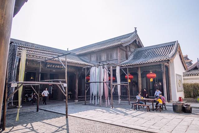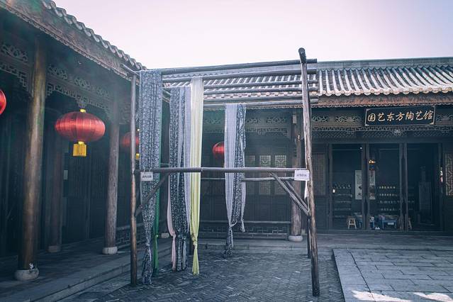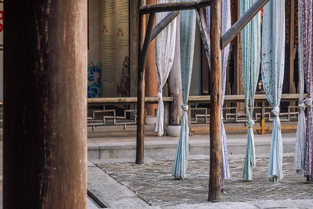 进入影视城,我们步入了一间大宅院,才发现原来这座江南大宅竟是一个大染坊,随处还能看到染布的痕迹。