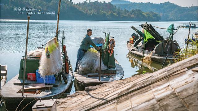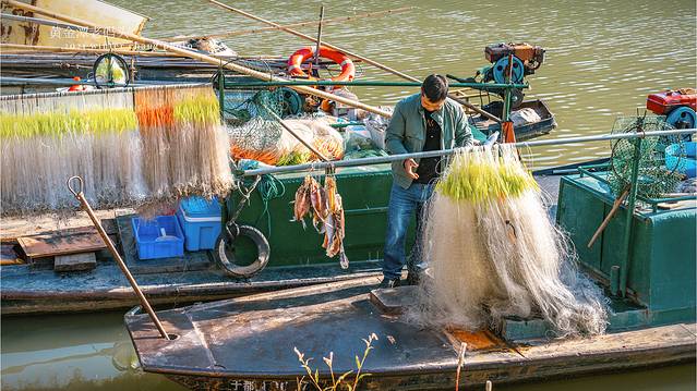 一望无际的江水,宛如水墨画般的远山,不禁让人感到心旷神怡。这里世世代代都是渔民,靠着打渔为生,岸边停了许多渔船,晒着白花花的网。