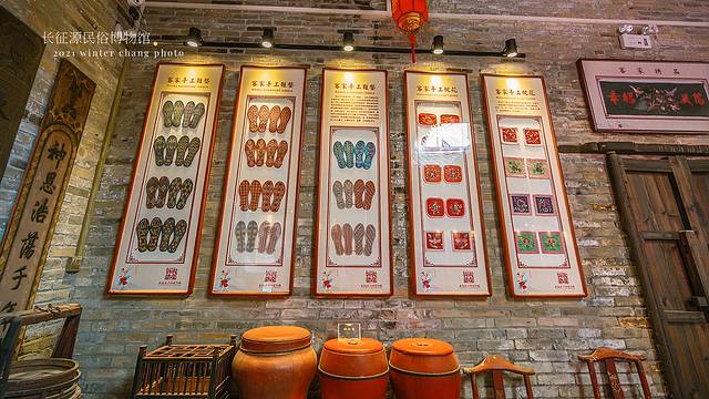 在民俗博物馆里,不仅展示了草鞋相关的制作器具和各式各样的草鞋,还有很多客家民俗文化的内容,一些绣品、银器、铜器、锡器都十分精致。
