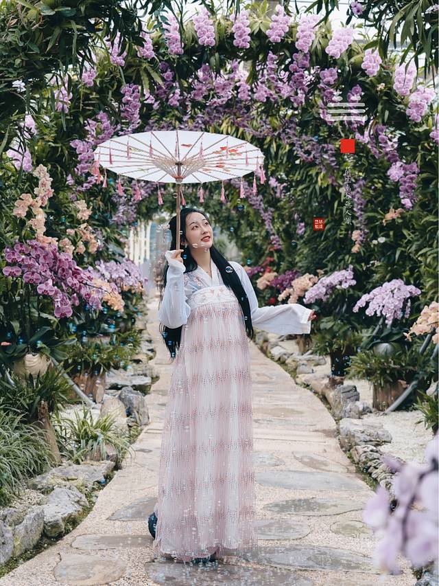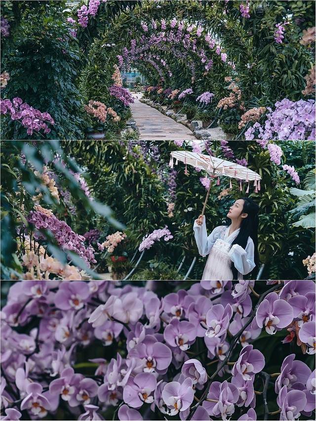 作为全省规模最大、标准最高的兰花基地,将近一万平米的展厅内,紫色的蝴蝶兰、白色的带叶兜兰、黄色与紫色相间的黄金甲,各色兰花在展厅里肆意绽放美不胜收。特别是穿着一身古装在这里拍照,更是风情万种。