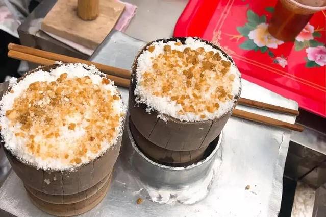 蒸蒸糕是用糯米面放在一个小木头模子上一个个蒸汽蒸出来的,口感软糯绵密,膏体湿润蓬松,丝毫不黏牙。