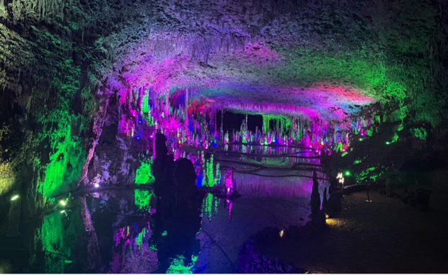 好看的是石林仙姿处,也是最容易出片的地方,在灯光的效果下,奇形怪状的钟乳石和洞里暗河相映成趣,将地底变成了一个奇妙的精绝世界。