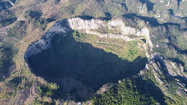 天坑,又叫天下第一大漏斗,这个大漏斗,又被当地人称为聚宝盆,长直650m、短径490m、深208m的大坑,比曾号称世界第一的美国阿里西波天坑还要大一倍。