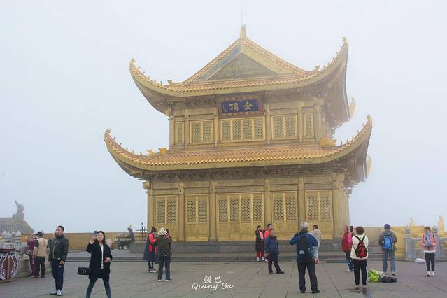 一大早的再走到金顶,金顶大雾笼罩,还下着微微细雨,气温只有3、4摄氏度,金顶上只有三五个游人,都是昨晚在山上过夜的游客。