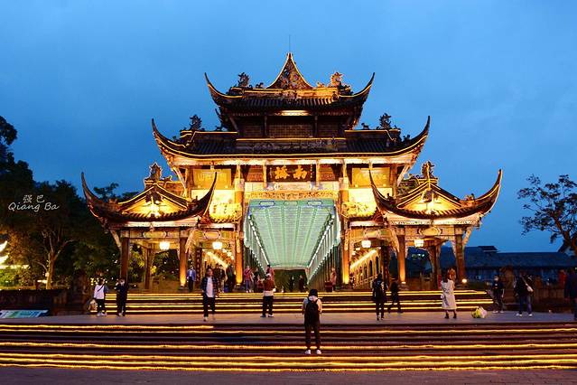 傍晚的都江堰南桥都会亮灯,灯光朗明的南桥有不少游人散步拍照。