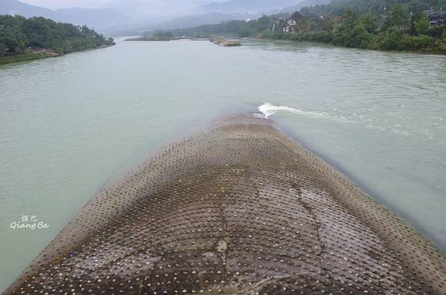 鱼嘴,鱼嘴是修建在江心的分水堤,把岷江分隔成外江和内江,外江排洪,内江引水灌溉。