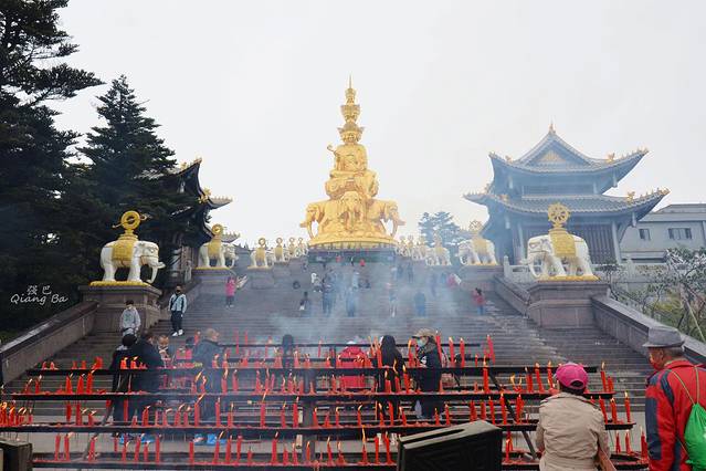 早上的峨眉山金顶大雾笼罩,十方普贤菩萨金像在雾中时隐时现,高台下参拜大道参拜普贤菩萨的信众众多,香烛鼎盛,烟火缭绕。