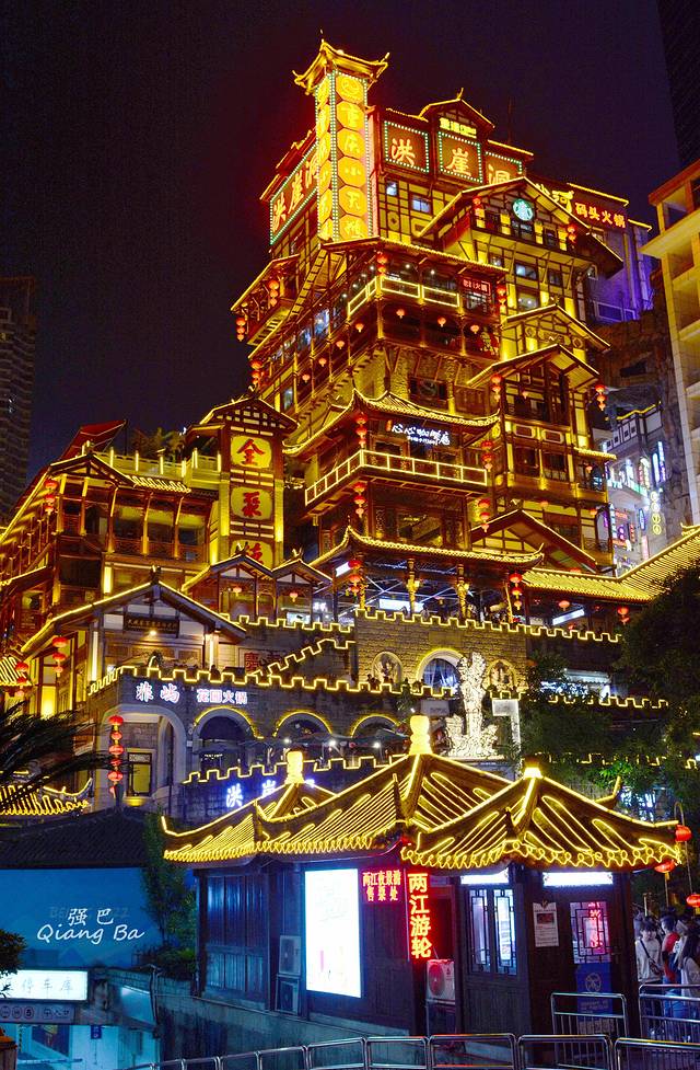 洪涯洞原为洪崖门,是重庆古城门之一,2006年改建成现在这个外型具有巴渝传统特色的11层吊脚楼式的建筑。