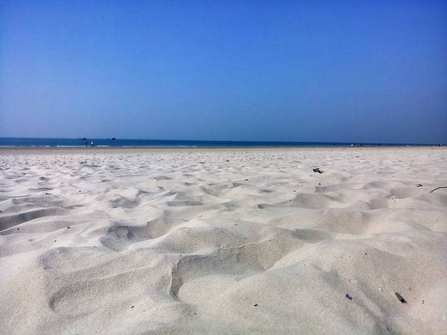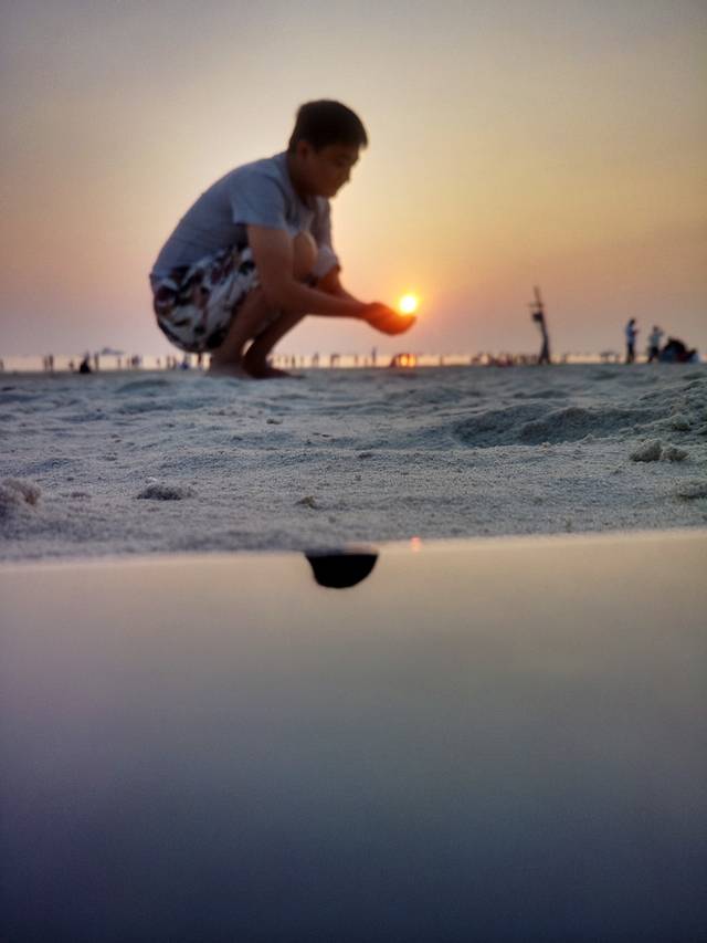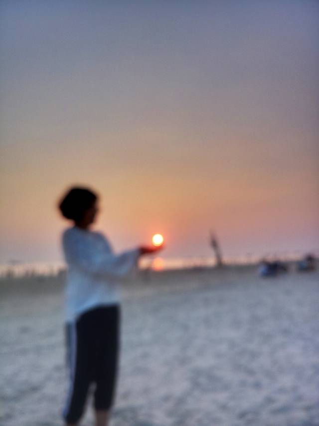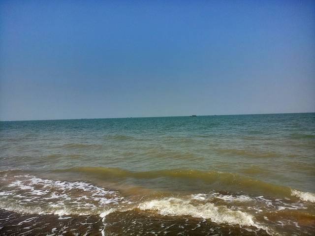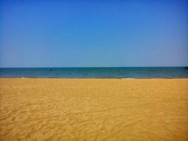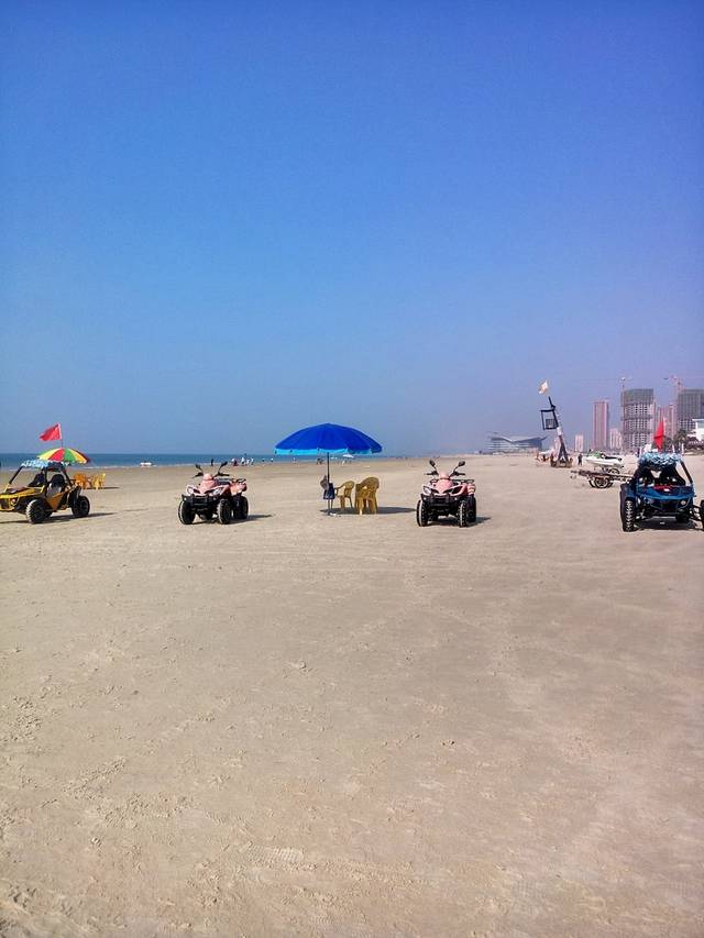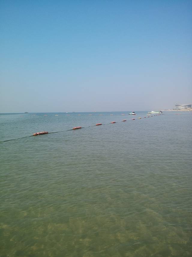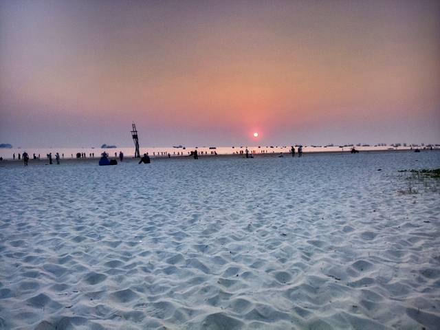 银滩的海水很清,沙滩很软很白,落日余晖,海风拂面,心情美美的。游客较多,我爱人骑摩托艇带着我逛了一圈,一百块钱,第二天我们才知道我们骑贵了。