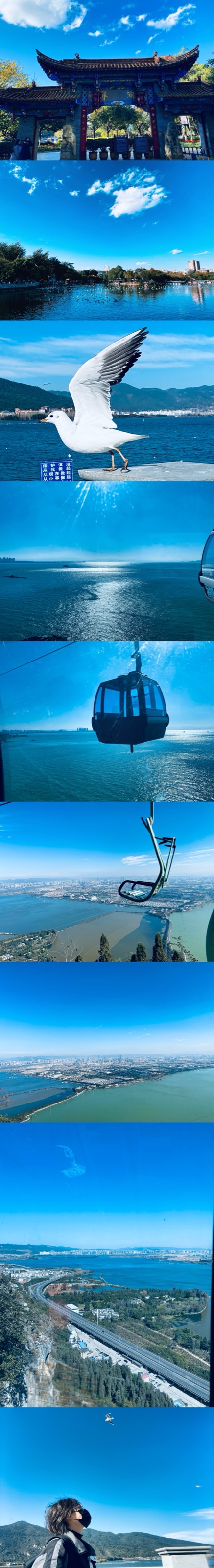 滇池是作为我昆明的第一站,从江苏到云南,一整个视觉享受,入眼可见到处都是蓝色,我相信大家应该都跟我一样,喜欢看天空或是大海那种很辽阔的感觉,会感觉突然一下子的那种身心都放松的感觉,天空澄碧,纤云不染,远山含黛,和风送暖。在那边看海鸥在你身边盘旋,视觉盛宴。西山的索道是那种悬空式的,我很喜欢,不过会有点晒,小仙女们记得带伞擦好防晒哦。封闭式的索道,因为我去的时候人不多,也挺舒适的,没有那种窒息感,外面太阳撒在水面上,反射出来的光感,别有一番风味。