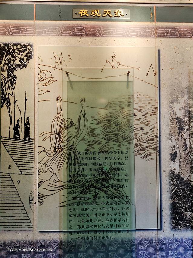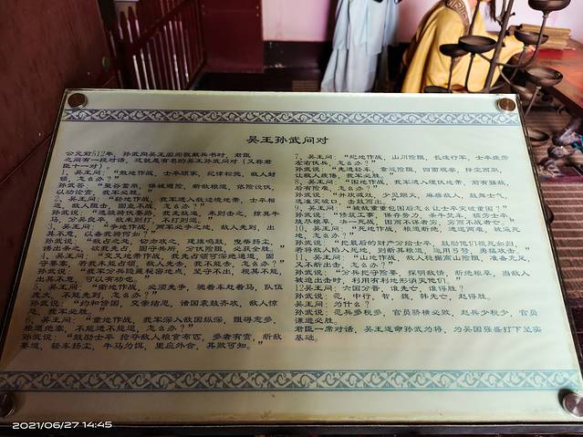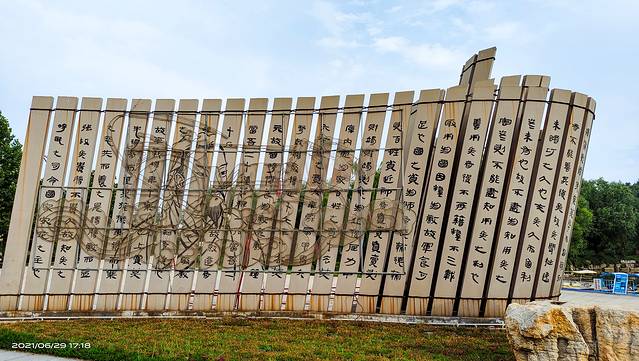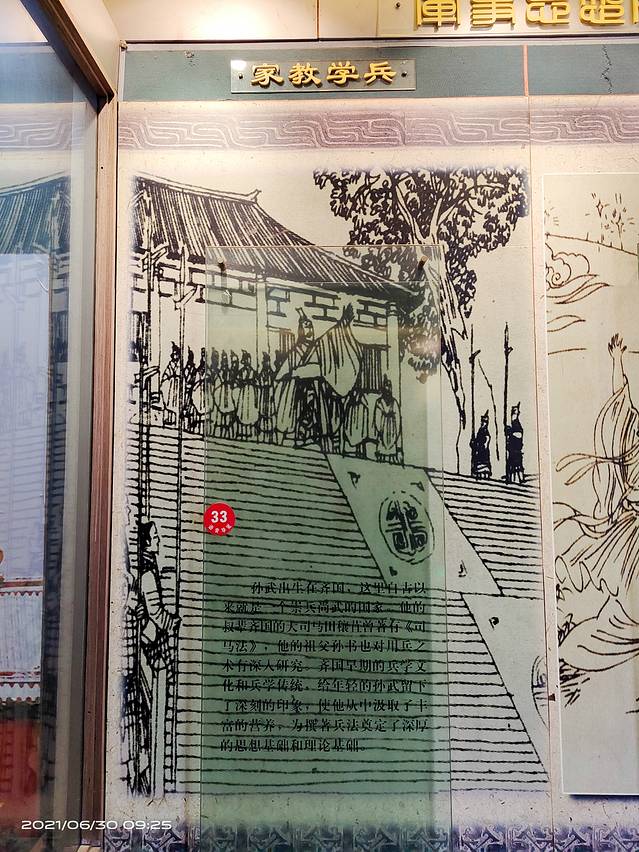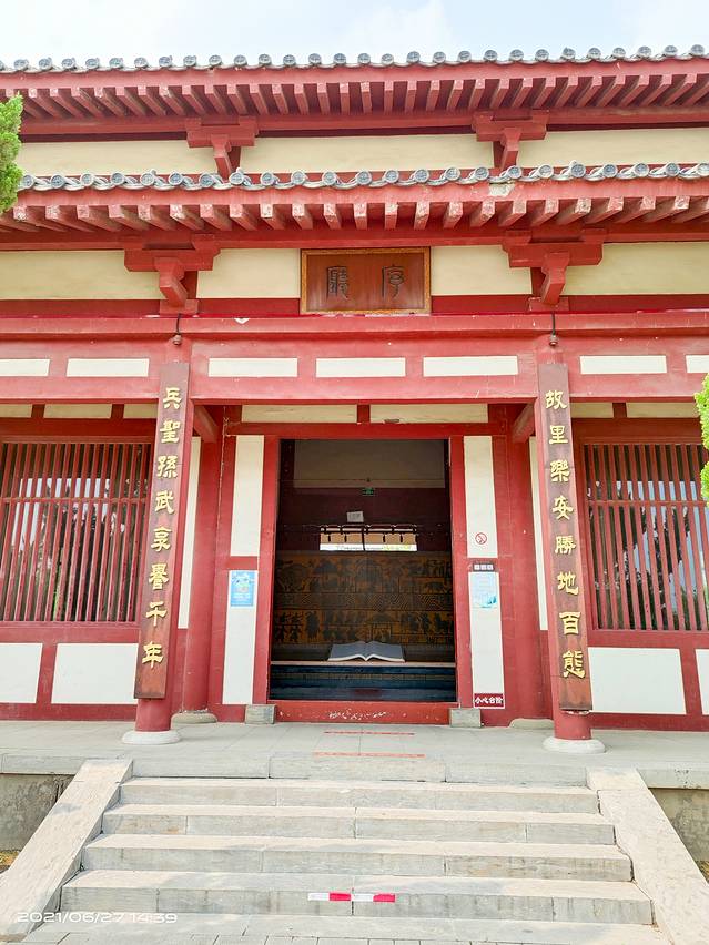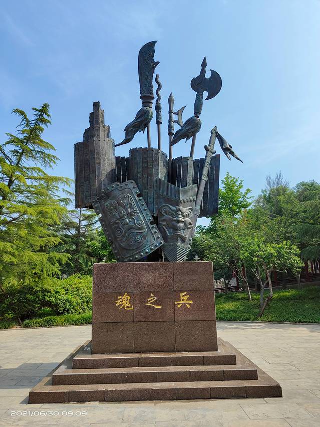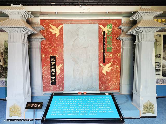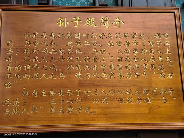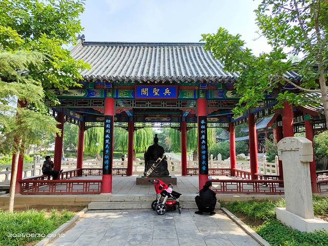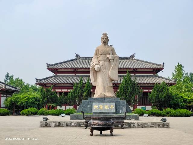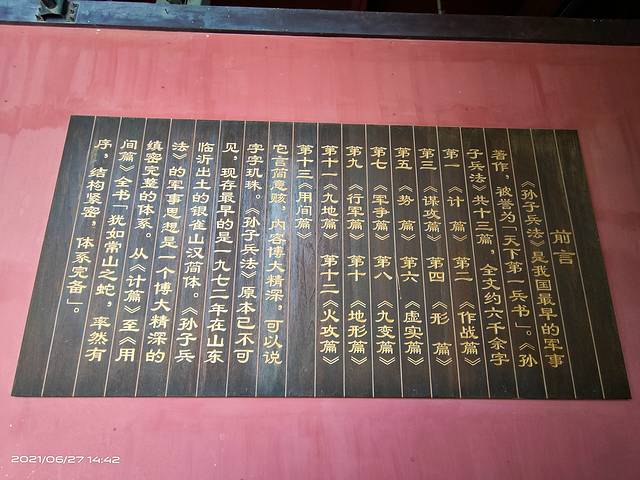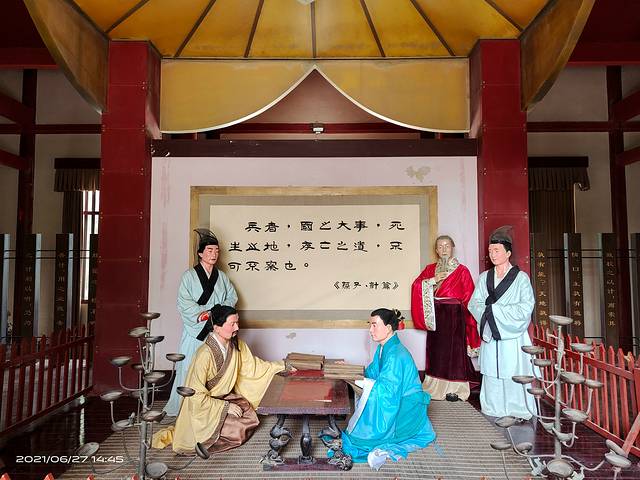 中国孙子兵法城位于山东省惠民县的西北隅,始建于2002年10月,是孙子故里人民为了纪念伟大的军事家孙武,充分挖掘弘扬孙子文化而修建的秦汉式大型园林建筑群。景区有15座大殿和224间厢房。整组建筑古色古香,汉韵十足。整个建筑群平面布局沿中轴线自南向北布置阙门和十五个大殿,纵向一字排开,全长999m,宽88m。第一大殿取名序殿,用于展示孙子家世和故里惠民历史文化。第十五大殿取名泽世殿,展示孙子文化的影响、流传,并兼做后门(德胜门)。中间十三个大殿展示孙子兵法十三篇,各殿分别用《孙子兵法》十三篇篇名定名。景区很大,内容十分丰富,是学习了解《孙子兵法》的好地方。我们在这里参观游览了近两个小时。