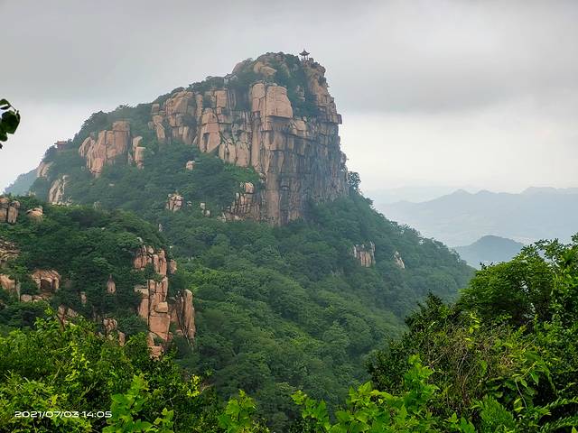 沂山风景区歪头崮。歪头崮位于沂山主峰玉皇顶的西北侧,海拔971米,是沂山的第四高峰。它与狮子崮、扁崮三足鼎立,同花枝台紧密相连,群峰峥嵘秀出,突兀矗立,高耸苍穹,四面峭壁若劈,三面临深谷巨壑,唯南面悬崖错盘间,有一条宽仅容身的崎岖小径可攀,极峰偏东南,且外探倾斜,似坠欲张,是沂山的第一胜境,有民谚说“到沂山不登歪头崮,如同入宝山空手归”。歪头崮有碧霞元君祠、福神庙、将军殿、山君庙(即山神)、通玄门、长春亭等遗址。