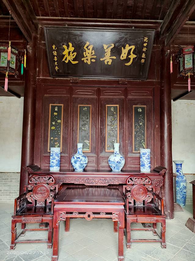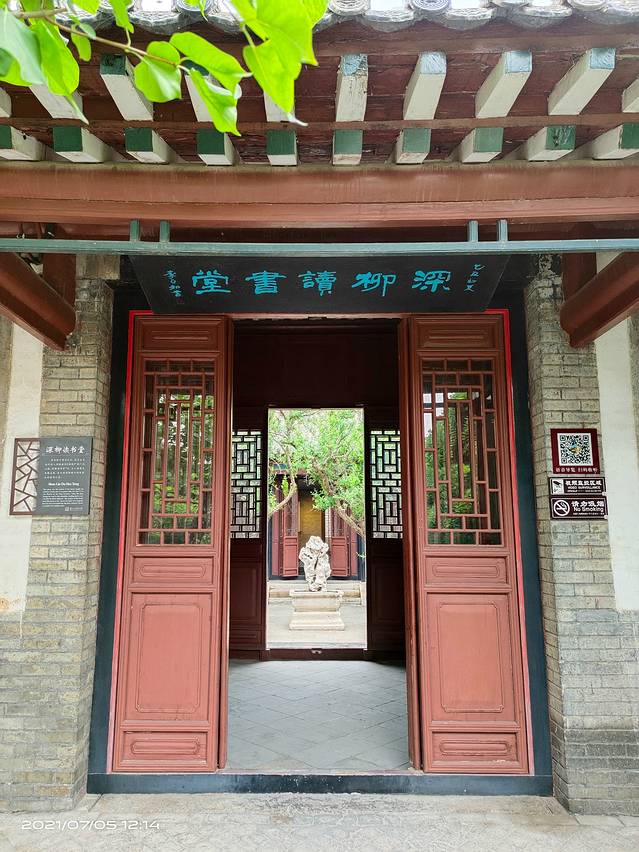 潍坊十笏园。西院的北过厅名叫深柳读书堂。唐诗人刘慎虚诗的《阙题》中有:“闭门向山路,深柳读书堂”句,因借用为书塾名称,表示自己志趣在于读书,不好交往,深深柳荫中的堂屋里正好读书。清代贺国嶙、何日浩、钱向杲等,都曾用此作书斋名称。
