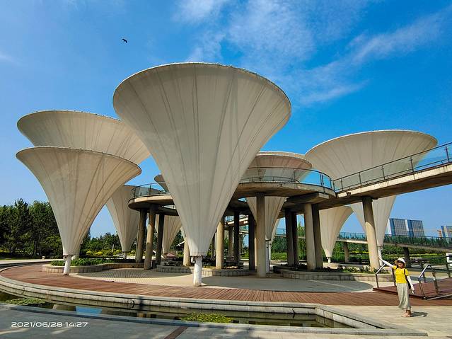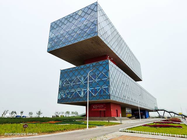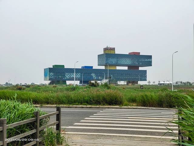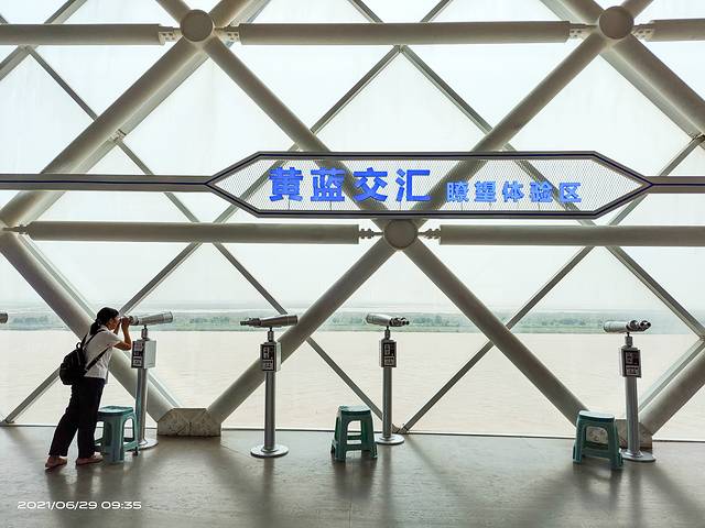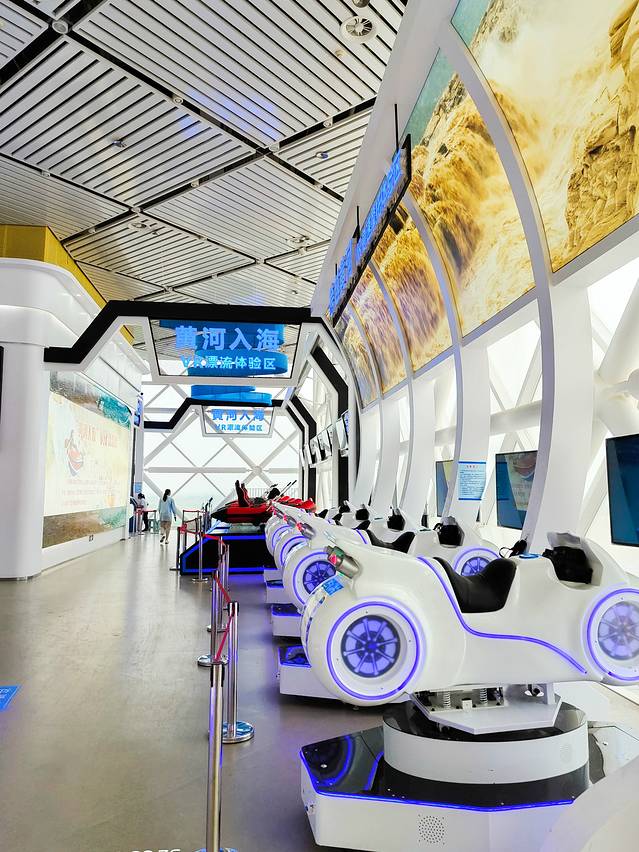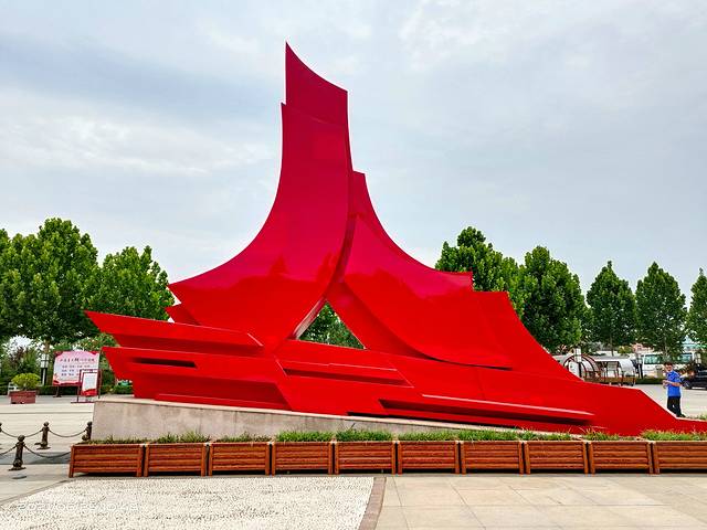 黄河口生态旅游区远望楼码头。远望楼,是十大齐鲁文化新地标,由同济大学建筑设计研究院设计的,总面积7616平方米,是集餐饮、候船、观光等多功能于一体的综合性超现代建筑。站在高高的观景平台上,可以远眺黄河入海,故名为“远望楼”,意为“远来黄河流不尽,望去渤海潮涌生”。远望楼建筑风格独特,是由四个核心筒所支撑起来的悬空结构。四个核心筒被绘制成彩色,象征着黄河口人民的热情、浪漫。