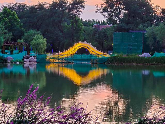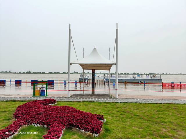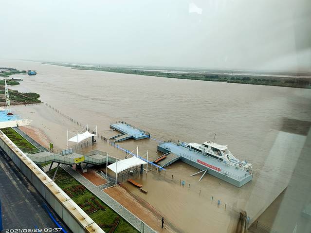 黄河口生态旅游区远望楼码头,由于黄河涨水,部分码头已经被水淹没。