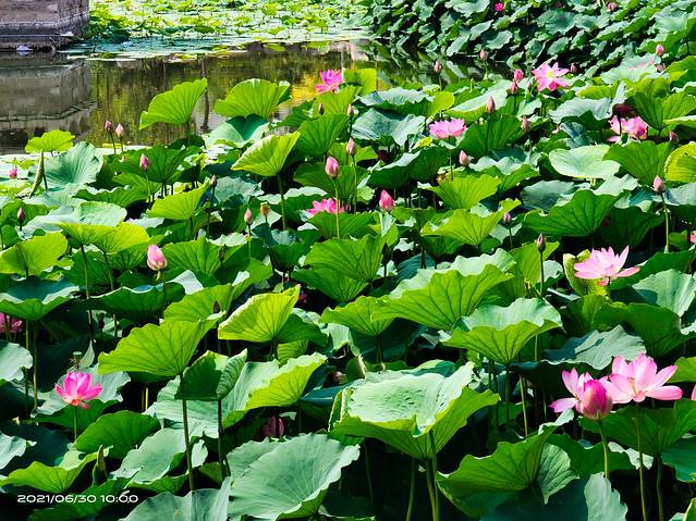 潍坊十笏园。四照亭”,取其四面阳光普照之义,故名。亭较大,方形,为六檩卷棚式歇山顶,四周有坐凳栏杆。该亭水环四面,荷风水月,颇饶诗意,西有曲桥同回廊相连。亭中有清代状元曹鸿勋所题“四照亭”横匾,亭外悬有“涛音”,是清代书法家桂馥手迹。亭柱上对联为“清风明月本无价,近水远山皆有情”,亭前悬对联“望云惭高鸟,临水愧游鱼”。顺回廊曲桥步入池心,四面环视,荷花满池,景色宜人。亭内石桌凳,是当年园主举觞流连,咏诗之处,四面桥栏可坐,可观赏池水荷花和假山全景。曲桥与回廊相接的地方,还有一副对联为“于心有不厌,即事多所欣”。