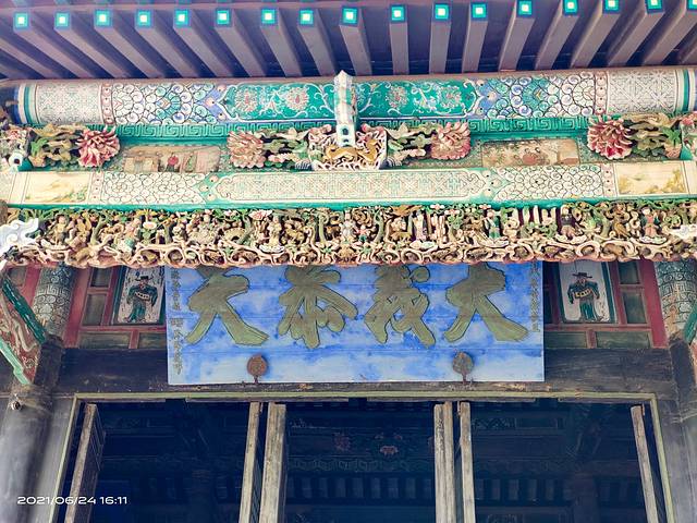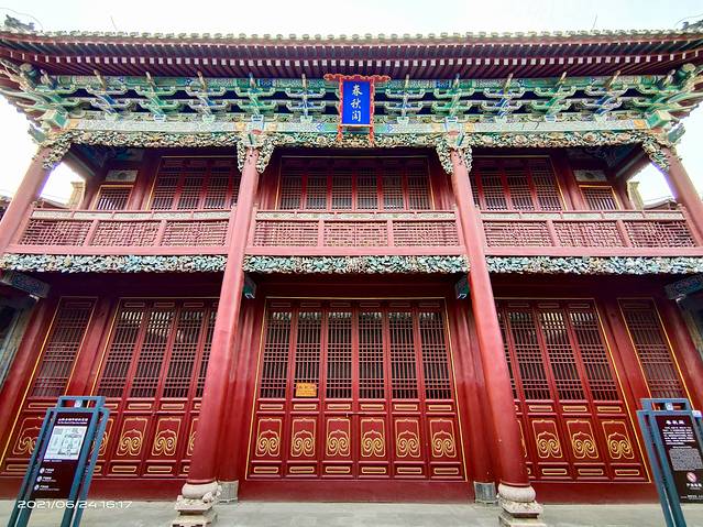 聊城山陕会馆春秋阁为会馆最后面、最高大的殿宇。面阔3间,上下2层,单檐歇山,灰筒瓦顶,斗拱抬梁式结构。阁前廊有四根木质檐柱,前廊额枋均为木刻透雕,雕饰人物和牡丹、金瓜、花卉等。