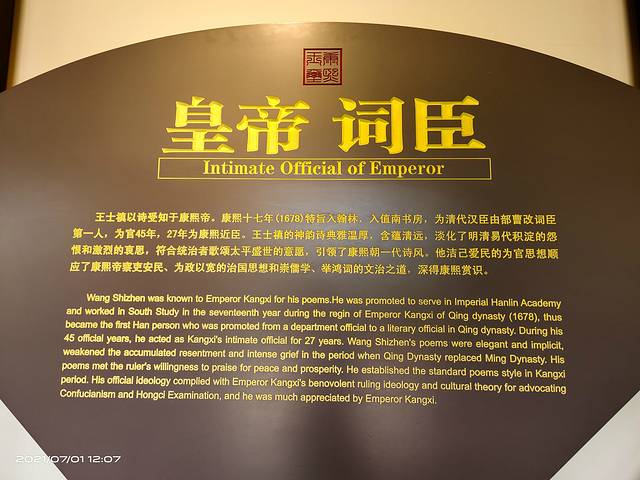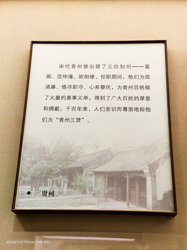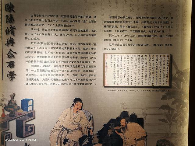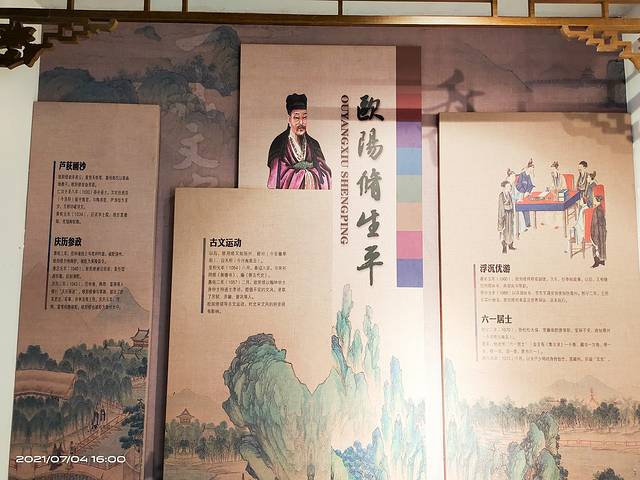 青州古城欧阳修纪念馆。欧阳修纪念馆在青州古城南门阜财门附近,是古城里主要的旅游景点之一。欧阳修纪念馆主要介绍欧阳修的生平成就,以及其在青州为官的历史。欧阳修出生于1007年,距今已有一千多年时间,出生地为四川绵阳,祖籍为江西永丰县。欧阳修进入仕途后,正好处于北宋的变革时期,他因为支持变法而触动了权贵的历史,曾经三次被贬。欧阳修在一千多年前曾在青州古城做官两年。作为唐宋八大家之一的欧阳修,因《醉翁亭记》而名扬天下。欧阳修号“醉翁”,晚号“六字居士”。进入纪念馆,一尊欧阳修的塑像就映入眼帘,塑像左边是介绍欧阳修张生评的陈列室,以图文的形式,详细介绍了欧阳修在青州。在纪念馆的最高处,修建了一座山斋,这里就是欧阳修在青州为官时的住所。欧阳修在青州还写下了一篇巨作《泷冈阡表》,是在其父亲去世六十年后写的一篇祭文,为我国古代三大祭文之一。第一展厅主要展示欧阳修在青州醉意山水的场景,他在青州的施政方针,以及他与青州山水、青州鞓红牡丹、青州砚的不解之缘;第二展厅主要展示欧阳修的文学成就和书法艺术;第三展厅主要展示欧阳修在金石学方面的成就,以及青州金石学的发展,展示青州金石藏品;第四展厅主要复原宋代书斋场景。