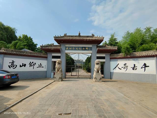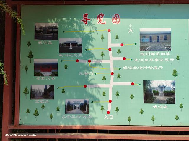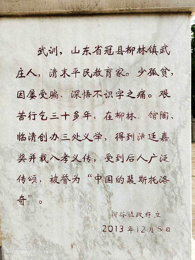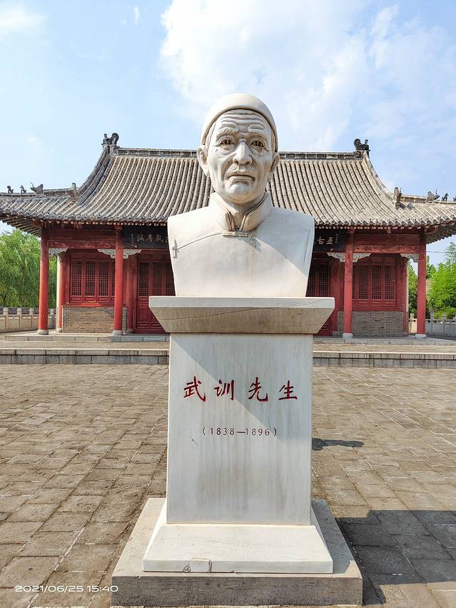 1896年12月5日千古奇丐武训先生在临清他所创办的御史巷义学去世,殁后葬于当时的崇贤义塾东壁外,即今墓所在位置。1989年6月重修。墓北面为陈列室,展示了武训的生平史迹及其文物。1995年9月,在祠前建百米碑廊,有各界著名人士,或撰文赞颂,或题辞纪念碑刻26块。在祠右前方建有高歌台,又名"嘤鸣台";在祠左前方建有"武训魂亭",亭额由著名学者季羡林题写。遗憾的是,纪念馆只有一个看门的大爷在看管,陈列室也没有开放,不能进入参观。纪念馆除了我们几个人,没有其他游人。
