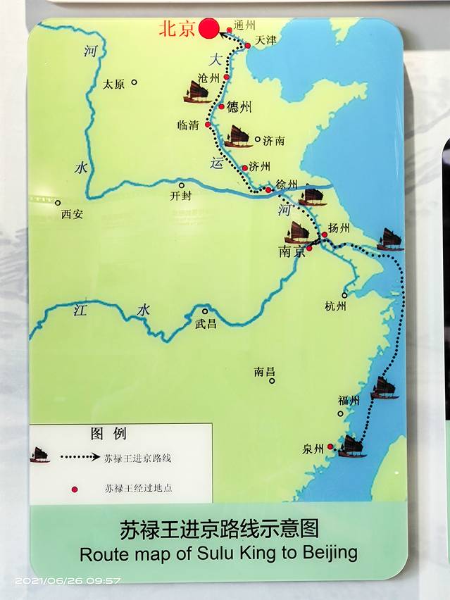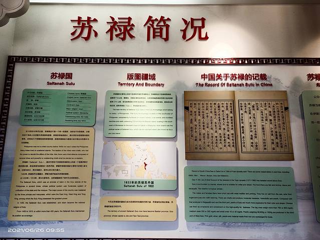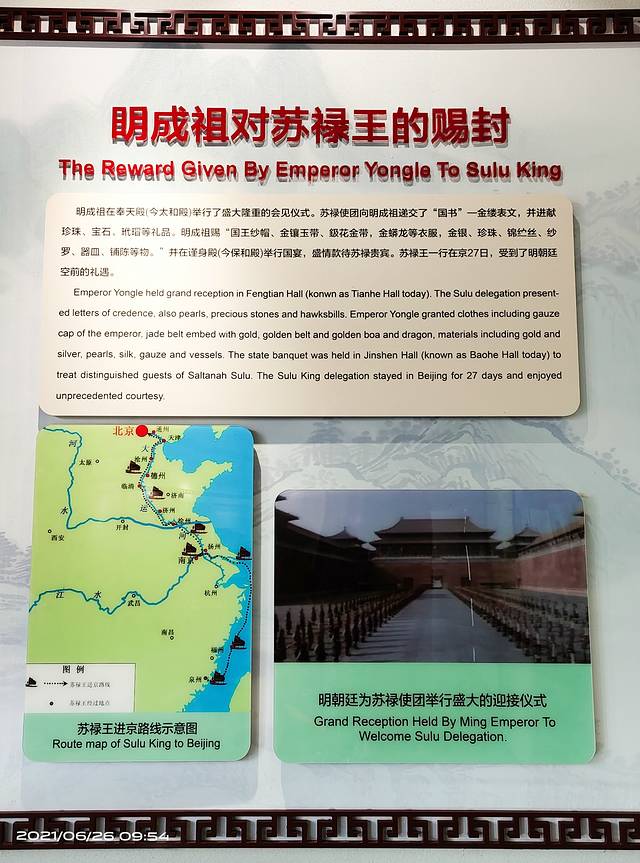 苏禄王墓,坐落在山东省德州市城区北部的北营村,安葬着苏禄国的一位国王和他的王妃及两位王子,是中国境内仅有的两座外国君主陵墓之一(另一座是位于南京的渤泥国王墓),也是我国唯一的驻有外国王室后裔守陵村落的异邦王陵。苏禄王墓是中菲两国传统友谊的见证。苏禄王墓是明朝初年国王陵墓中保存较为完好的一座。1988年1月13日,被国务院公布为第三批全国重点文物保护单位。明朝永乐十五年(1417年),古苏禄国是一个信奉伊斯兰教的酋长国。国内分为东王、西王、峒王三家王侯,以东王巴都葛叭答剌为尊。三王率领家眷、官员共340多人组成友好使团,远渡重洋,从福建泉州登岸,经苏州、杭州沿京杭大运河至北京,受到了永乐皇帝的隆重接待。苏禄使团在京居留27天,三王辞归,1417年9月13日,到达德州以北的安陵时,东王突患急症,不幸染病殒殁。讣告到京,明成祖深为哀悼,派礼部郎中陈世启赴德州,为东王举行了隆重的葬礼,谥曰:恭定。并为其在德州城北十二连城九江营的西南部择址建陵 ,明成祖亲自撰写悼文。东王妃葛木宁、次子温哈剌、三子安都鲁及侍从共10人留居中国.