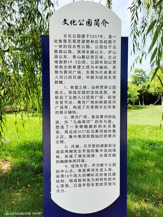 东营文化公园,北起黄河路,南至南一路,西起庐山路,东到香山路。园内有未来之桥、黄河魂广场、月湖、绽放东营等景点。东营文化公园是东营的名片。