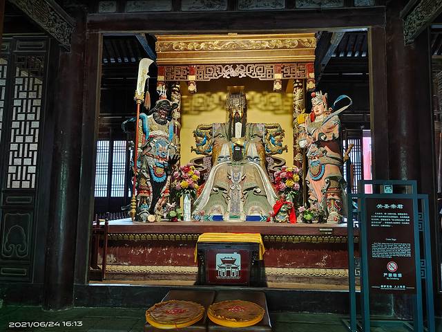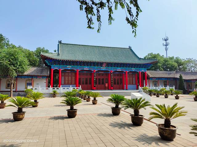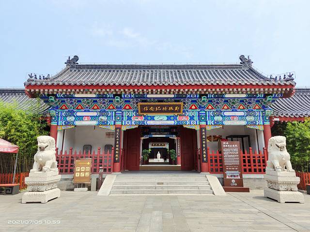 在潍坊市区的十笏园文化街区,有一座香火鼎盛的千年古庙:关帝庙。它位于十笏园的西南方向,这里曾经是潍县城的几处至高点之一。关帝庙始建于宋代,奉祀三国时期蜀汉大将关羽,是潍坊市区现存的最为古老庙宇。庙前有石阶,石阶之上为山门,院内大殿建于青石砌成的高台之上,民间传说此高台为刘备发兵救助北海相孔融时的阅兵处。高台旁边的古槐,为刘关张拴马处。在大殿内塑有关羽、周仓、关平塑像,大殿飞檐斗拱,气势宏伟。庙院东南角有钟楼一座,内有大钟一口。关帝庙大殿偏北建有孔融祠,供奉东汉北海相孔融,祠内有孔融塑像,孔融祠始建于宋代政和四年,原来旧址在潍州州府北面的城墙顶上,后来到清代康熙三十二年迁移至此,孔融和关羽从此做了仅以一墙之隔的邻居,和睦共处三百多年的风雨。关帝庙和孔融祠在一个景区,一个入口进出。孔融(153~208),汉末文学家,曾任北海(治今潍城西南)相,鲁国(今曲阜)人,孔子20世孙,为人恃才负气,善属诗文,为“建安七子”之一。后人辑有《孔北海集》。