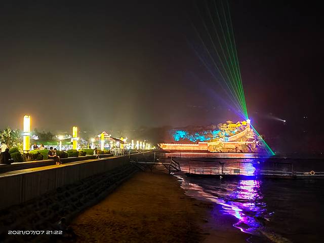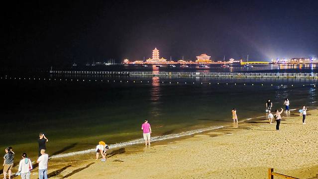 蓬莱海滩夜景,远处是蓬莱阁景区。