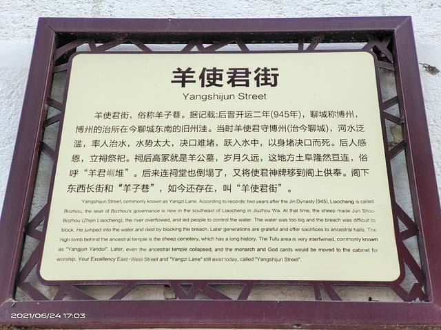山陕会馆北有一石板路,东起古运河西岸,西至米市街,长220米,宽5米,名羊使君街,俗称羊子巷,为市民居住区。穿过羊使君街,就来到米市街。在聊城,羊使君街和米市街曾是连接运河大码头和城内的主要道路,是货物集散的主要通道,在解放前这里也是聊城最繁华富庶的街道之一。