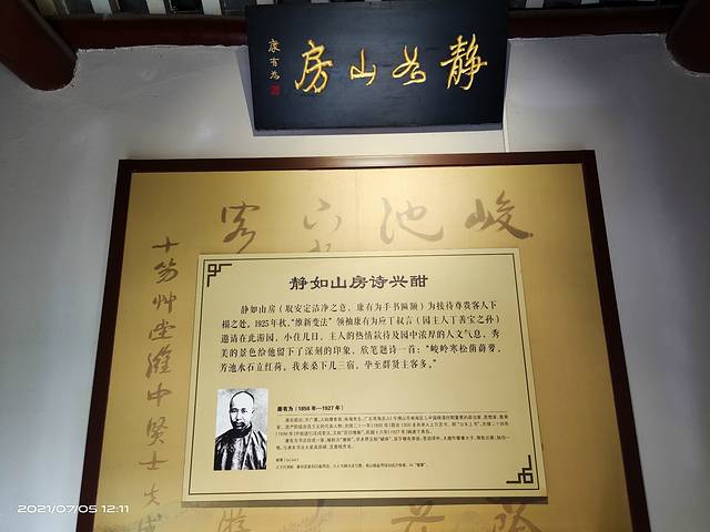 潍坊十笏园。西轴线上一排西厢房共八开间,其院称作园中园。自南至北,第一为静如山房,取其安静闲雅、洁净之意,是比较高级的客房。