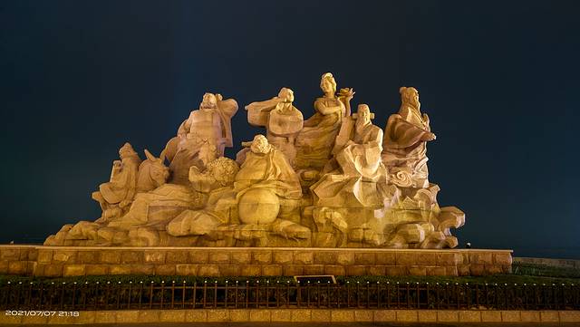 蓬莱海滩夜景,蓬莱海滨八仙过海雕塑。