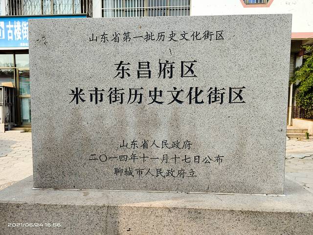 米市街是条聊城古老的商业街,是漕运兴盛时期,聊城最早的粮食集散地。在清宣统二年(1910)《聊城县志》上有明确记载。当年,这里粮店汇聚,大到粮行、粮栈,小到粮户、粮亭,鼎盛时期足有数十家。每日里买进卖出,交易繁忙,街面上车水马龙,人来人往。外购外销的车辆则南去龙湾运河岸,然后经旱路或水路南通北达。新中国成立后,米市街上陆续驻有粉末冶金厂、鞋厂、家具厂、县豫剧团、二轻供销科等企事业单位,现在还能看见一些单位的痕迹。