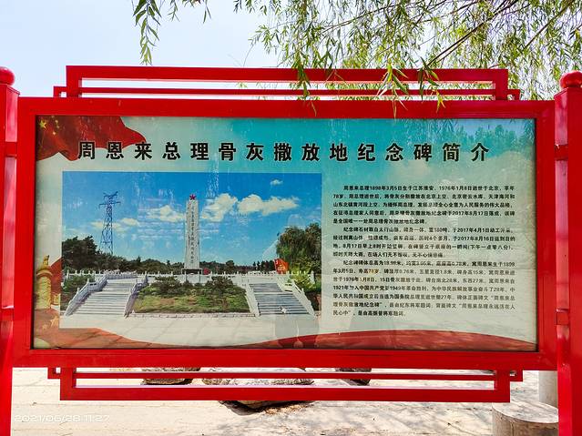 1976年1月8日,周恩来总理在北京逝世。遵照他老人家先前遗愿,于1月15日晚8时许,将周恩来总理的最后一包骨灰,撒放在了山东滨州黄河入海口,了却了周恩来总理生前的夙愿。滨州人民怀着对周恩来总理的敬仰爱慕之情,建起了由周恩来总理身边工作人员高振普、纪东两位将军亲自题写碑名的周恩来骨灰撒放地纪念碑。这幢纪念碑,成为鲁北大地上的地标性建筑。纪念碑石材取自太行山脉,石质为花岗岩景观石。碑身一体,重180吨。纹路似流水,如黄河奔涌、波浪翻滚,现黄河之水天上来之奇观。碑体总高为18.98米,均宽3.05米,底座高0.78米,寓周恩来生于1898年3月5日,享年78岁。碑顶厚0.76米,五星直径1.8米,碑身高15米,寓周恩来逝世于1976年1月8日,15日骨灰撒放于此。碑台南北28米,东西27米,寓周恩来自1921年加入中国共产党至1949年革命胜利,为中华民族解放事业奋斗了28年,中华人民共和国成立后就任国务院总理任职27年。