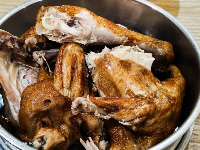 德州扒鸡是中国山东传统名吃,鲁菜经典。德州扒鸡制作技艺为国家非物质文化遗产。早在清朝乾隆年间,德州扒鸡就被列为山东贡品送入宫中供帝后及皇族们享用。德州扒鸡闻名全国,远销海外,被誉为“天下第一鸡”。本来打算去餐馆吃晚饭时点德州扒鸡,去了才知道,餐馆一般都没有,德州扒鸡是在超市或者专卖店销售。因此,专门在酒店附近找到了这家扒鸡店花了34元买了一只扒鸡,带回酒店吃。德州扒鸡还真的好吃,口感很好,味道鲜美,很香。