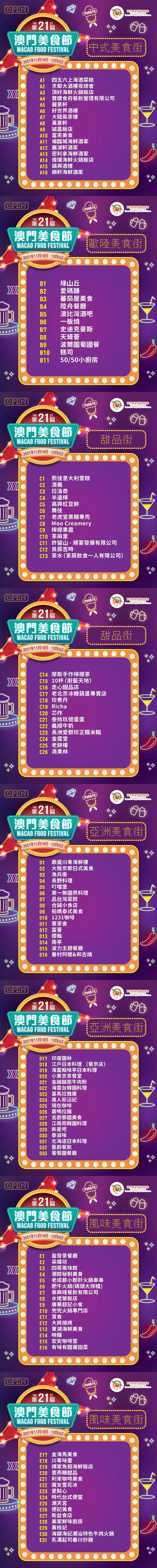 今年第二十一届澳门美食节结逾百家本地特色餐饮商号,【从11月19日到12月5日】一连17日为市民及旅客搜罗各种特色美食,全方位展现澳门“美食之都”的活力与魅力!包含六大块,“中式酒楼街”、“欧陆美食街”、“亚洲美食街”、“风味美食街”及“甜品街”,汇聚众多美味,不能错过~