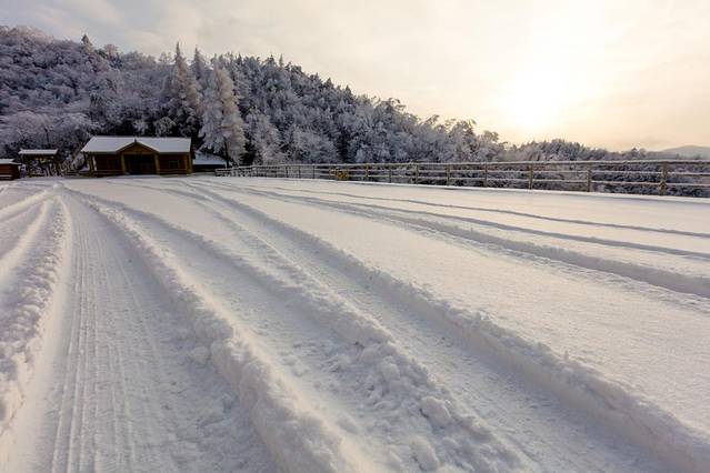 道路上厚厚的积雪,被过往的车辆已经压出一道道痕迹。积雪很松软,透过照片都可以看得出这里的雪质真的很赞!本以为这里的风景已经漂亮了,没想到后面的美景更令人着迷!