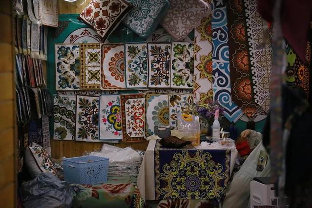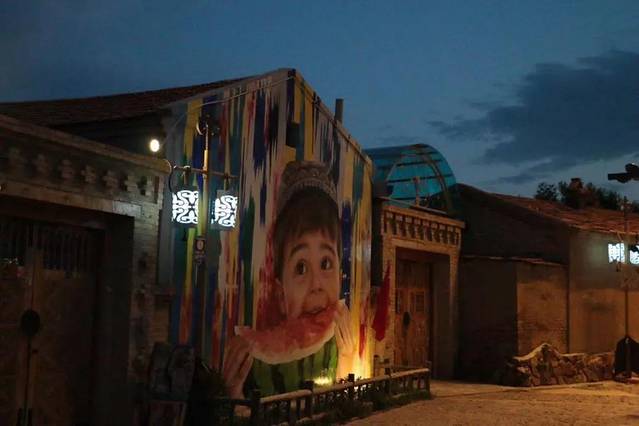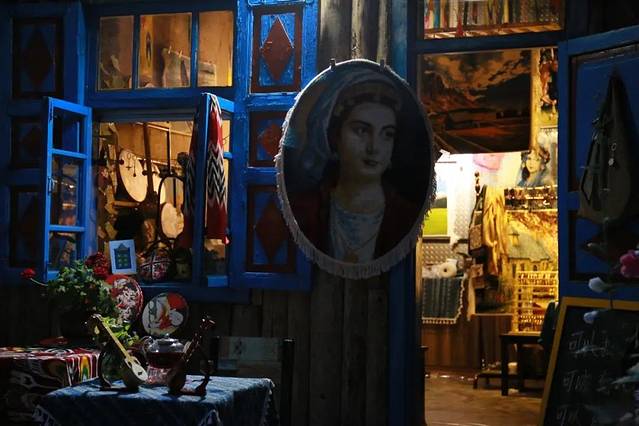 这里的街道是很有新疆特色的蓝色建筑和涂鸦,商贩特色服饰与小吃。