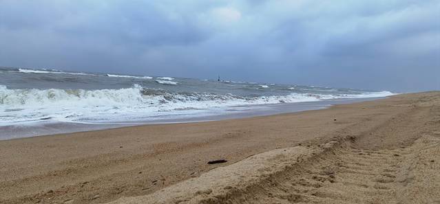 站在玉带滩上,这一侧是南海,因为过两天有台风,海浪很大。