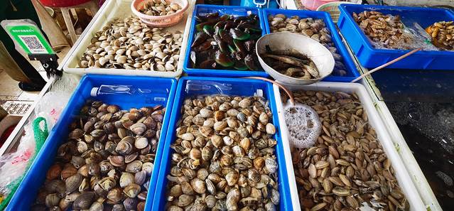 在老码头的步行街上,有海鲜市场,旁边就可以加工。非常新鲜,价格小贵。