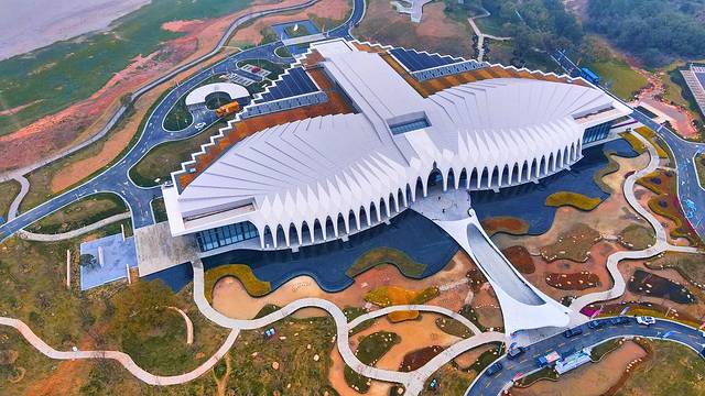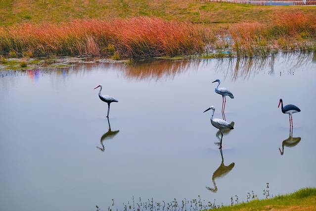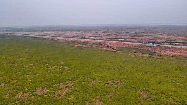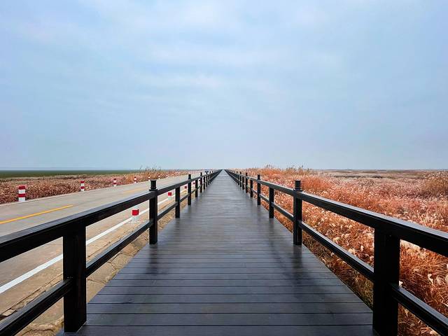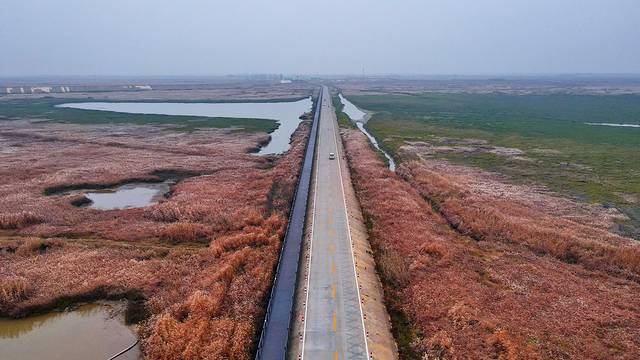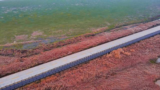 现在虽是枯水期,但蜿蜒的公路、辽阔的滩涂草地,片片芦荻花丛,还有远处不时传来的雁鸣鹤唳,自然之美令人沉醉!