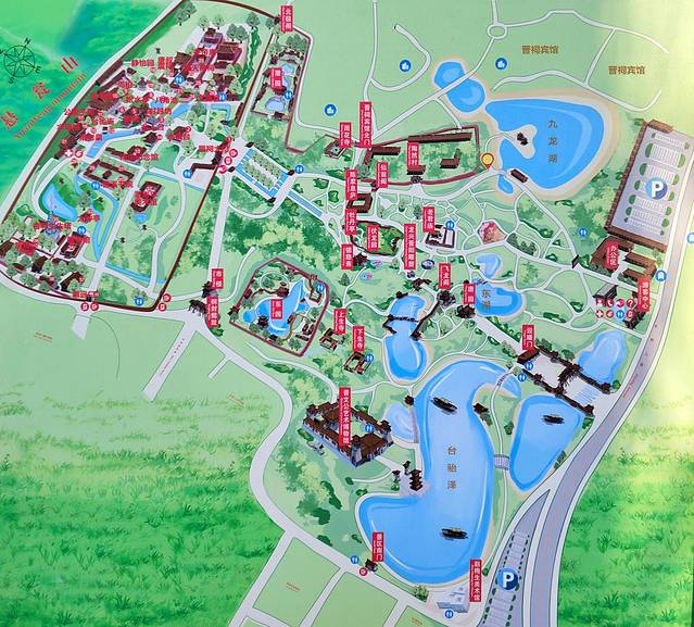 导览图中,正门在右边的迎曦门处,左边框内是晋祠,其它是园林。